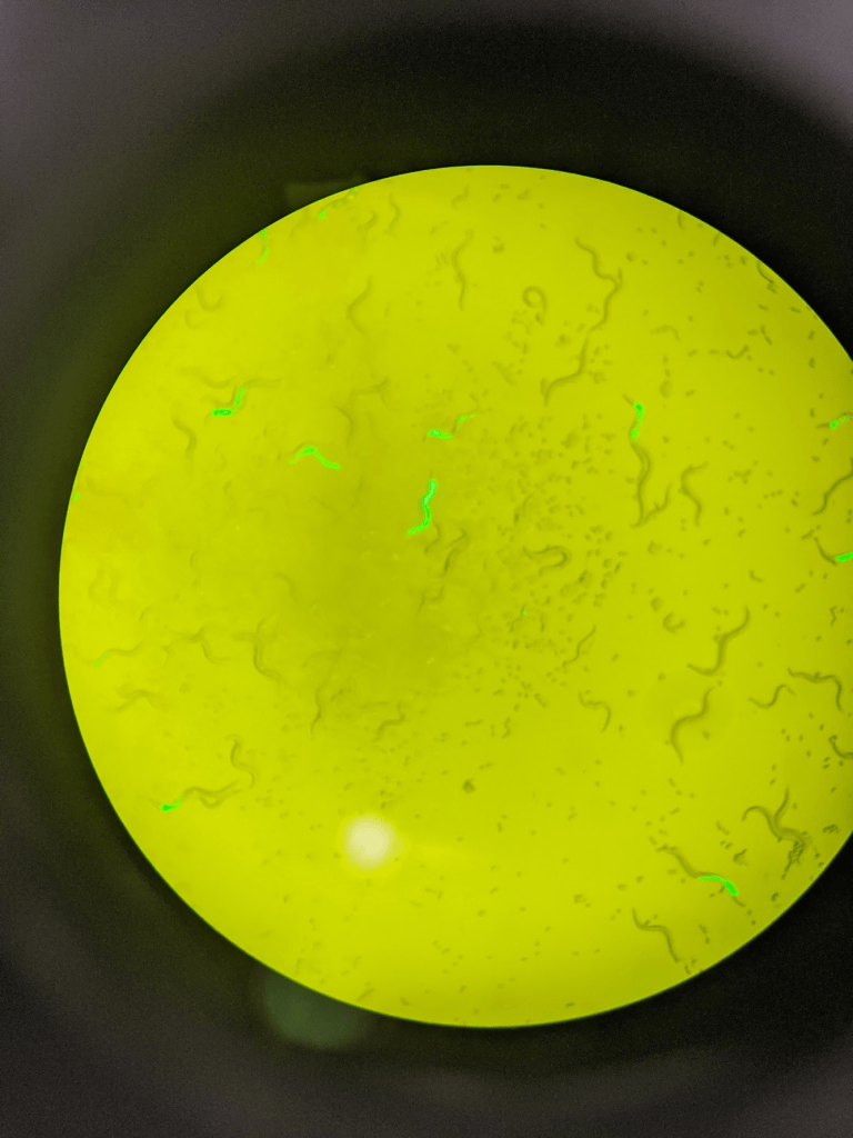In our lab, we have several strains of C. elegans that have been genetically modified to produce fluorescent proteins when they become infected. We will mix the wild nematodes with these special C. elegans (we call them “infection reporter worms”) and if the wild worms transmit an infection to the C. elegans, the C. elegans will begin to glow! We will then try to isolate the infection to determine what is causing it.